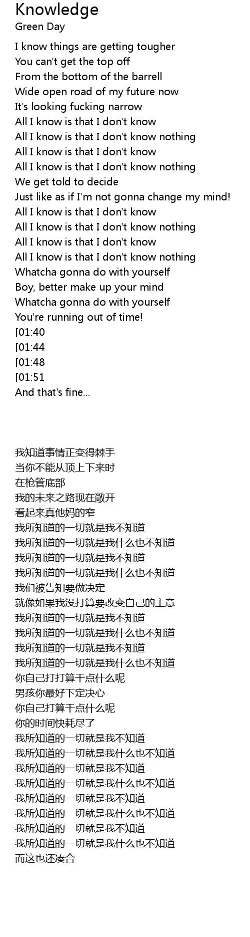| [01:58][01:44] | All I know is that I don't know nothing |