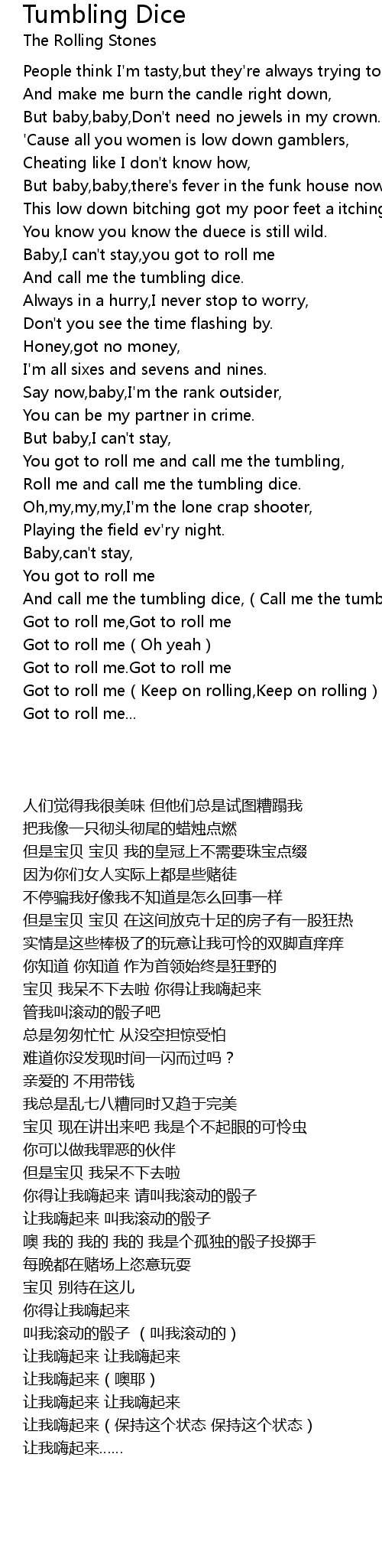 | [02:23.598] | And call me the tumbling dice, Call me the tumbling |