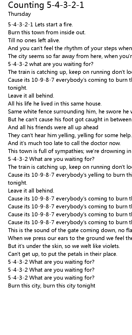 Cause its 10-9-8-7 everybody's yelling to burn this city, burn this city down tonight.