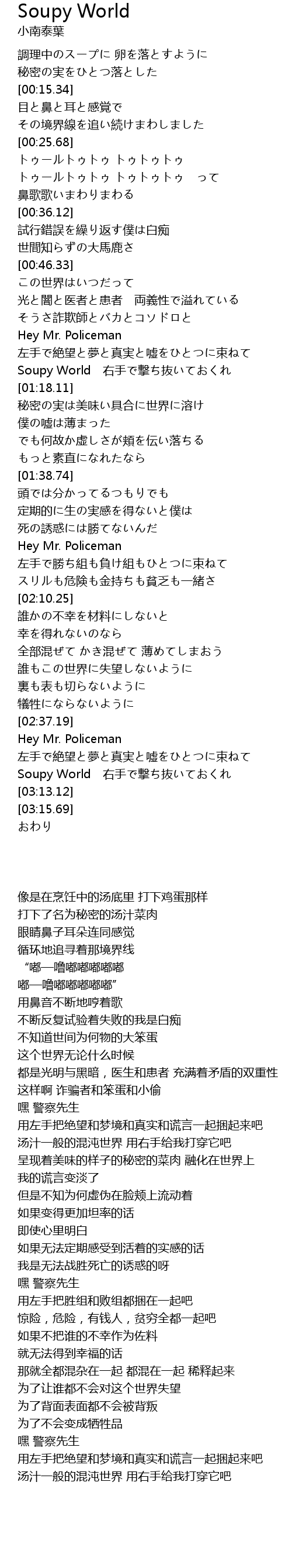 | [03:06.56] | Soupy World 右手で撃ち抜いておくれ |