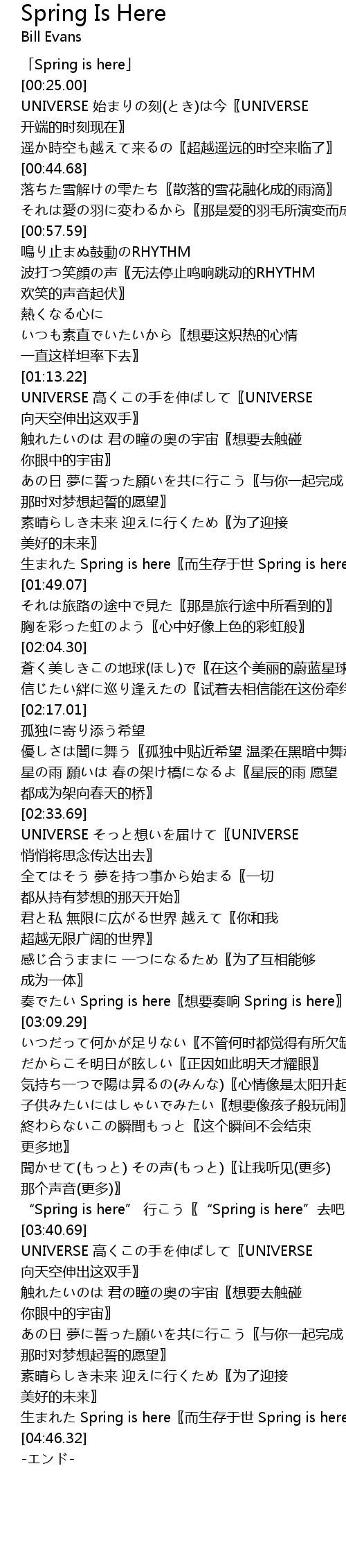 | [04:39.84] | 生まれた Spring is here〖而生存于世 Spring is here〗 |