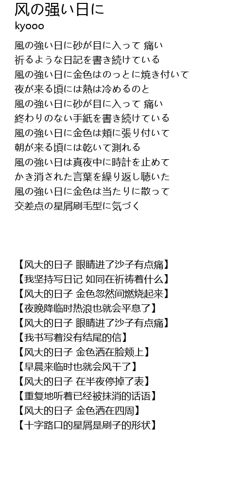 | [00:03.000] | 風の強い日に砂が目に入って 痛い |