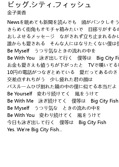 | [01:09.150] | Be With You 泳ぎ出して行く 僕等は Big City Fish |