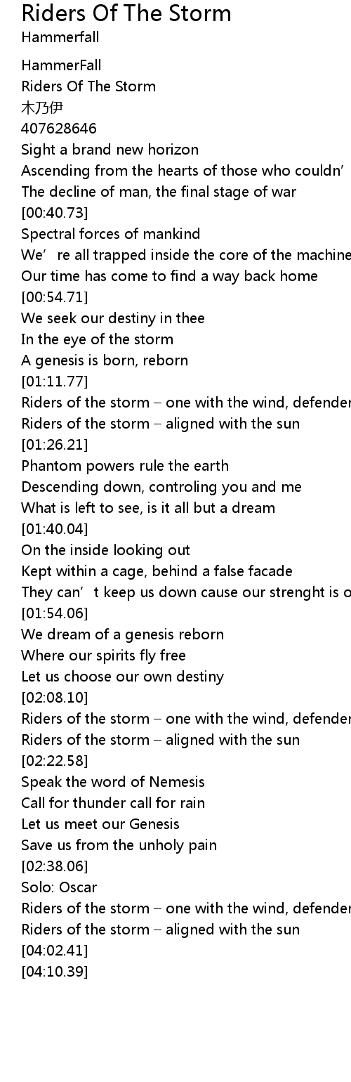 | [01:12.41] | Riders of the storm – one with the wind, defenders of creation |