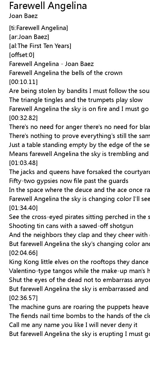 But farewell Angelina the sky is erupting I must go where it's quiet |