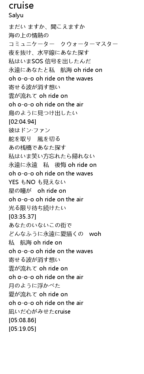 | [05:01.64] | 凪いだ心がみせたcruise |