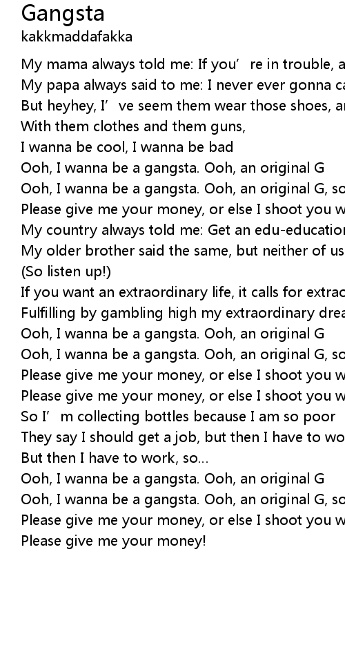 | Ooh, I wanna be a gangsta. Ooh, an original G, so come on | |