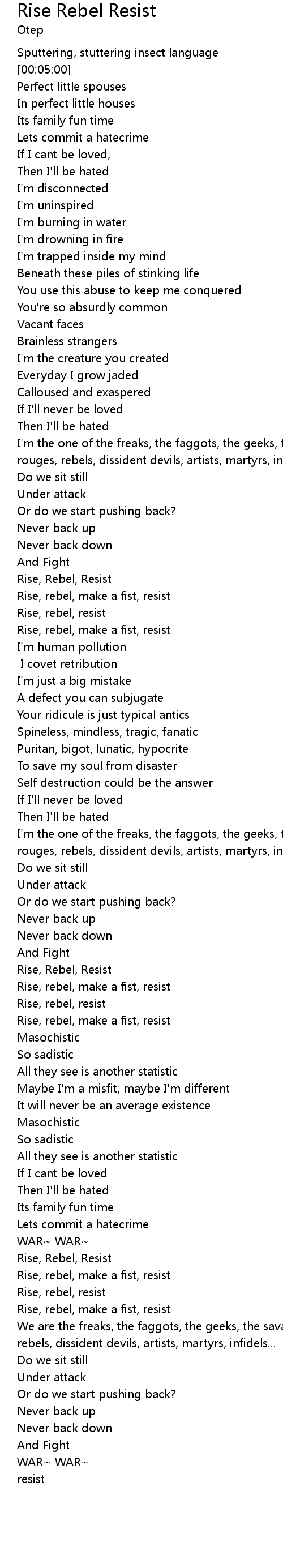 | [03:31:00] | Rise, rebel, make a fist, resist |