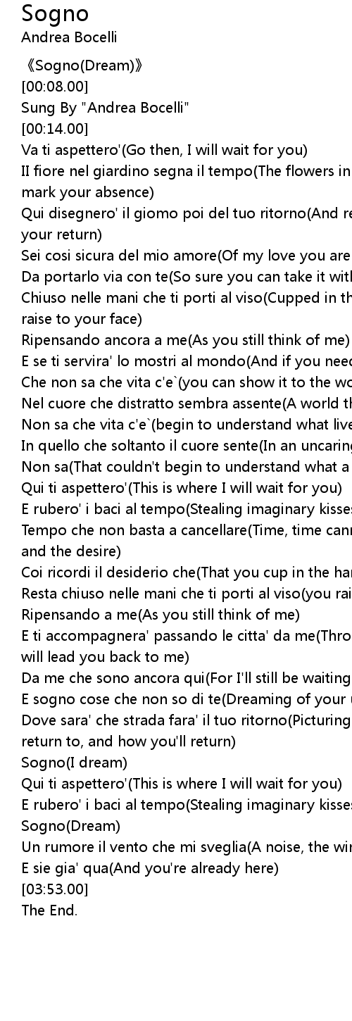 | [02:34.00] | Da me che sono ancora qui For I' ll still be waiting here, dreaming |