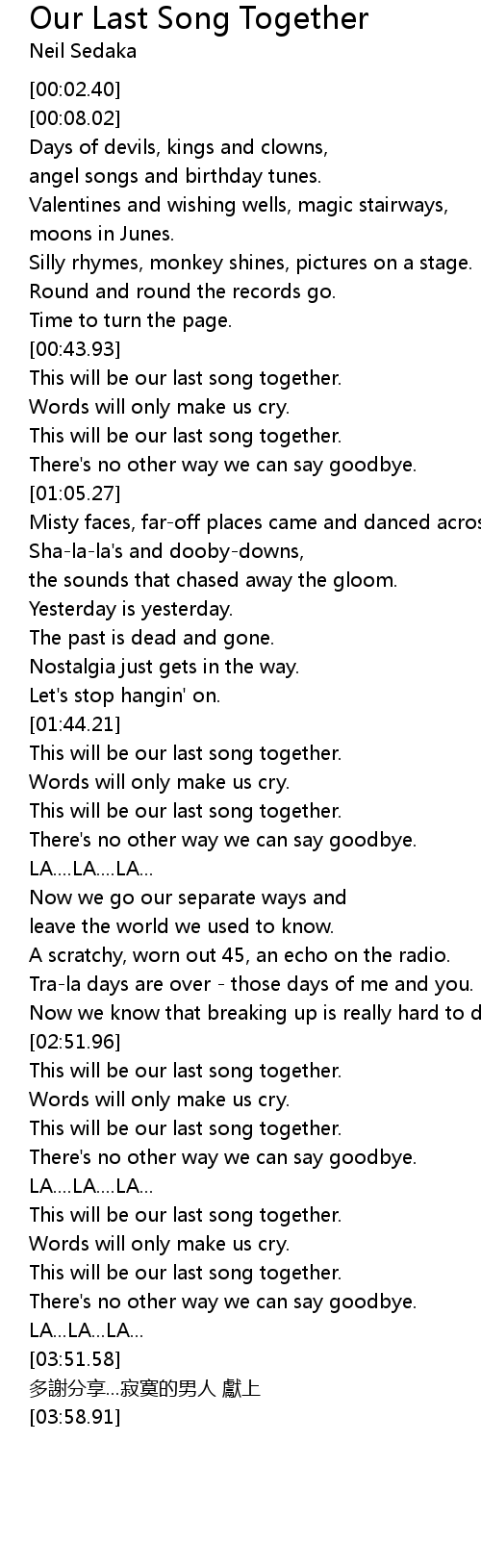 | [02:42.71] | Now we know that breaking up is really hard to do. |