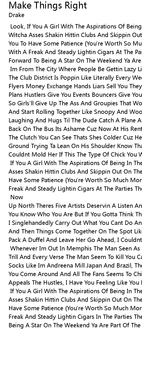 [Chorus:] Look, If You A Girl With The Aspirations Of Being In The Background Witcha Asses Shakin Hittin Clubs And Skippin Out On The Class You Takin I Ask You To Have Some Patience (You're Worth So Much More) To My Dudes At The Bar With A Freak And Steady Lightin Cigars At The Parties They Sneak In And Look Forward To Being A Star On The Weekend Ya Are Part Of The Speech Coz [Verse 1: Drake] Im From The City Where People Be Gettin Lazy Litterin In The Streets And The Club District Is Poppin Like Literally Every Week And Promoters'll Push Flyers Money Exchange Hands Liars Sell You They Dreams And Dummies Exchange Plans Hustlers Give You Events Bouncers Give You Pass Directors Give Em A Shot So Girls'll Give Up The Ass And Groupies That Would Flock To Hometown Athletes And Start Rolling Together Like Snoopy And Woodstock Daffy And Bugs, Its All Laughing And Hugs Til The Dude Catch A Plane And She Back Where She Was Right Back On The Bus Its Ashame Cuz Now At His Rental She Throwin Bricks Like Shaq In The Clutch You Can See Thats Shes Colder Cuz He Doesnt Hold Her Fall Flat On The Ground Trying Ta Lean On His Shoulder Know That He Tried Ta Told Her That He Couldnt Mold Her If This The Type Of Chick You Wanna Be When You Older, I Say [Chorus:] If You A Girl With The Aspirations Of Being In The Background Witcha Asses Shakin Hittin Clubs And Skippin Out On The Class You Takin I Ask You To Have Some Patience (You're Worth So Much More) To My Dudes At The Bar With A Freak And Steady Lightin Cigars At The Parties They Sneak In And Look Forward To Being A Star On The Weekend Ya Are Part Of The Speech Coz [Verse 2: Drake] Now Up North Theres Five Artists Deservin A Listen And Im One Of Em, The Other Four You Know Who You Are But If You Gotta Think Through Chances Are That It Aint You I Singlehandedly Carry Out What You Cant Do And See I Take A Couple Of Breathers And Then Things Come Together On The Spot Like A Couple Thats Eager If You Wanna Pack A Duffel And Leave Her Go Ahead, I Couldnt Give Two Damns Like A Couple Of Beavers But Uh, The In & The Out [?] Whenever Im Out In Memphis The Man Seen As Trill And Every Verse The Man Seem To Kill You Can Find Him With Black Jays And Socks Like Im Andreena Mill Japan And Brazil, The Audience Acreaming And Then You Come Around And All The Fans Seems To Chill Advances To Deals, Financing Appeals The Hustles, I Have You Feeling Like You Dancing In Heels And Uh [Chorus:] If You A Girl With The Aspirations Of Being In The Background Witcha Asses Shakin Hittin Clubs And Skippin Out On The Class You Takin I Ask You To Have Some Patience (You're Worth So Much More) To My Dudes In The Bar With A Freak And Steady Lightin Cigars In The Parties They Sneak In And Look Forward To Being A Star On The Weekend Ya Are Part Of The Speech Coz