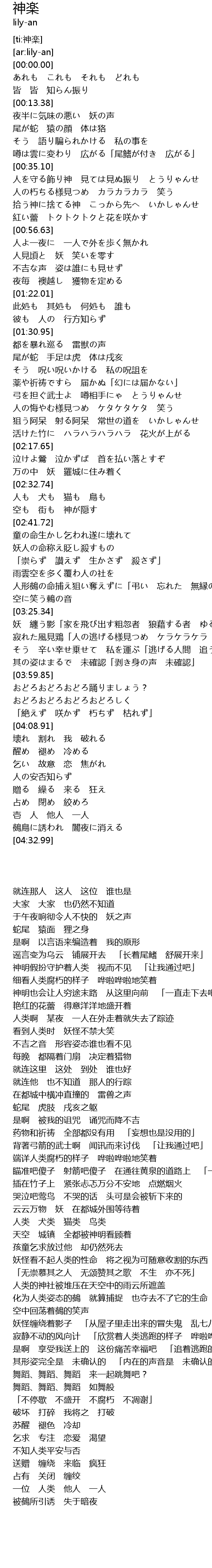 | [02:23.59] | 万の中 妖 羅城に住み着く |