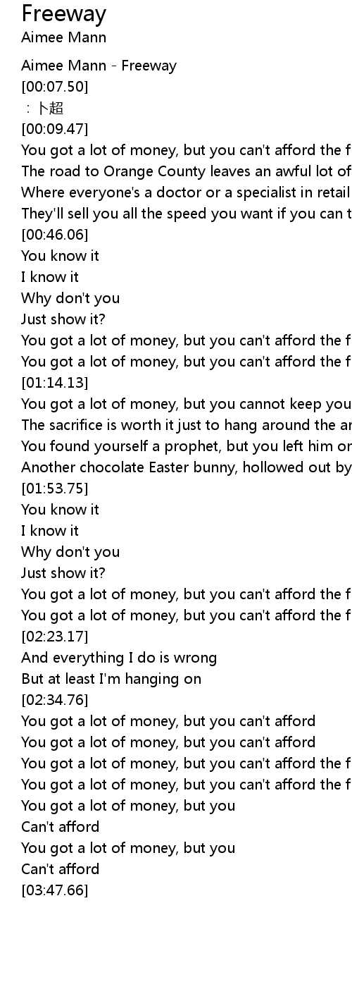 | [00:58.53] | You got a lot of money, but you can' t afford the freeway |