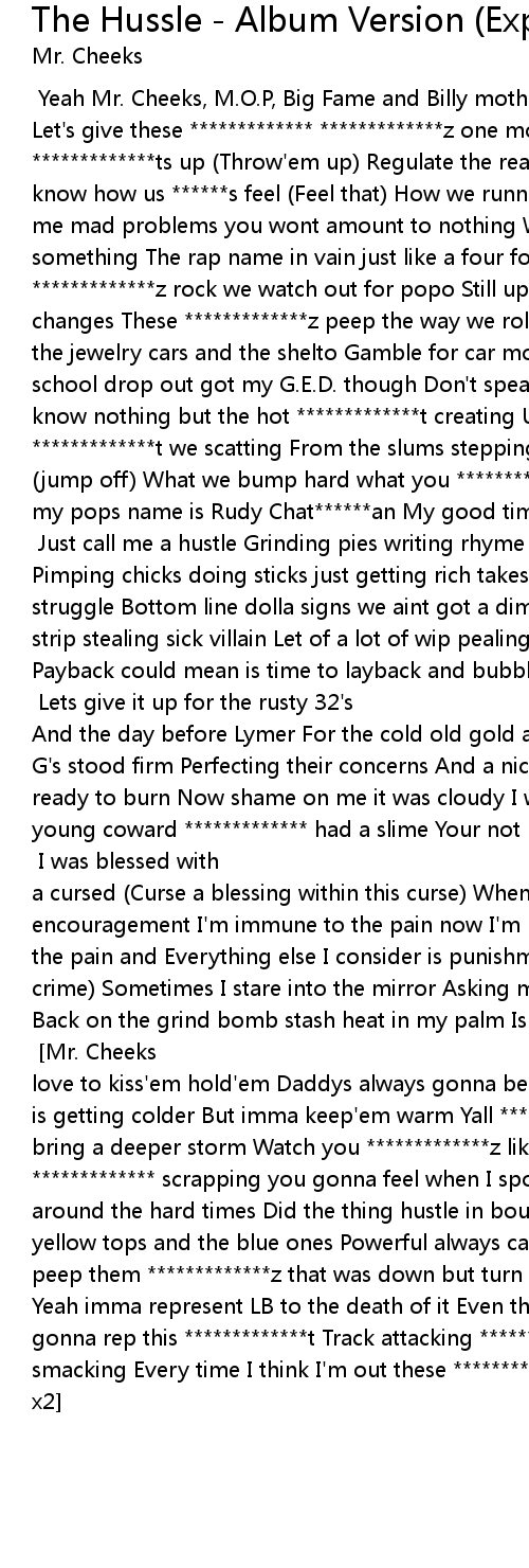 [Mr. Cheeks] Yeah Mr. Cheeks, M.O.P, Big Fame and Billy mother ******g Danze Let's give these ************* *************z one more chance Throw them *************ts up (Throw'em up) Regulate the real (Regulate) Ayo we basically know how us ******s feel (Feel that) How we running *************z Ayo they gave me mad problems you wont amount to nothing Well look at me now I did amount to something The rap name in vain just like a four four No matter were us *************z rock we watch out for popo Still up in the struggle I see nothing changes These *************z peep the way we roll so we holding bangers Sport the jewelry cars and the shelto Gamble for car money drink let the L blows High school drop out got my G.E.D. though Don't speak about what I got the d-low Yo I know nothing but the hot *************t creating Up on the road trips and hot *************t we scatting From the slums stepping representing the jump off (jump off) What we bump hard what you *************z bump soft Lived in Red Hook my pops name is Rudy Chat******an My good times always started with whats happening [Chorus] Just call me a hustle Grinding pies writing rhyme 9 to 5 Pimping chicks doing sticks just getting rich takes muscle Saga of a every day struggle Bottom line dolla signs we aint got a dime we gotta hustle Clip feeling strip stealing sick villain Let of a lot of wip pealing gangsta type scuffle Payback could mean is time to layback and bubble But other times payback is trouble Just call me a hustle [Billy Danze] Lets give it up for the rusty 32's And the day before Lymer For the cold old gold and the loks marijuana When the G's stood firm Perfecting their concerns And a nickel spot with a single shot ready to burn Now shame on me it was cloudy I was blind I was thinking that this young coward ************* had a slime Your not LB your not M.O.P I brought tripping from my whole different angle to spot me [Lil Fame] I was blessed with a cursed (Curse a blessing within this curse) When curse became innershment encouragement I'm immune to the pain now I'm loving it I'm encourage to fakes the pain and Everything else I consider is punishment (Take it one day at a crime) Sometimes I stare into the mirror Asking my self we it all went wrong Back on the grind bomb stash heat in my palm Is a cold world my ************* so bundle and warm [Chorus] [Mr. Cheeks] Ayo listen my daughter is getting older I love to kiss'em hold'em Daddys always gonna be there for you I told'em The world is getting colder But imma keep'em warm Yall *************z wanna get it on I bring a deeper storm Watch you *************z like a job if I got to ************* scrapping you gonna feel when I spot you I grew up in this raised around the hard times Did the thing hustle in boulevard dimes The red tops yellow tops and the blue ones Powerful always came through with some new one I peep them *************z that was down but turn ******ess Ever since Tah pass Yeah imma represent LB to the death of it Even though you left kid I'm still gonna rep this *************t Track attacking ************* ************* smacking Every time I think I'm out these *************z pull me back in [Chorus x2]