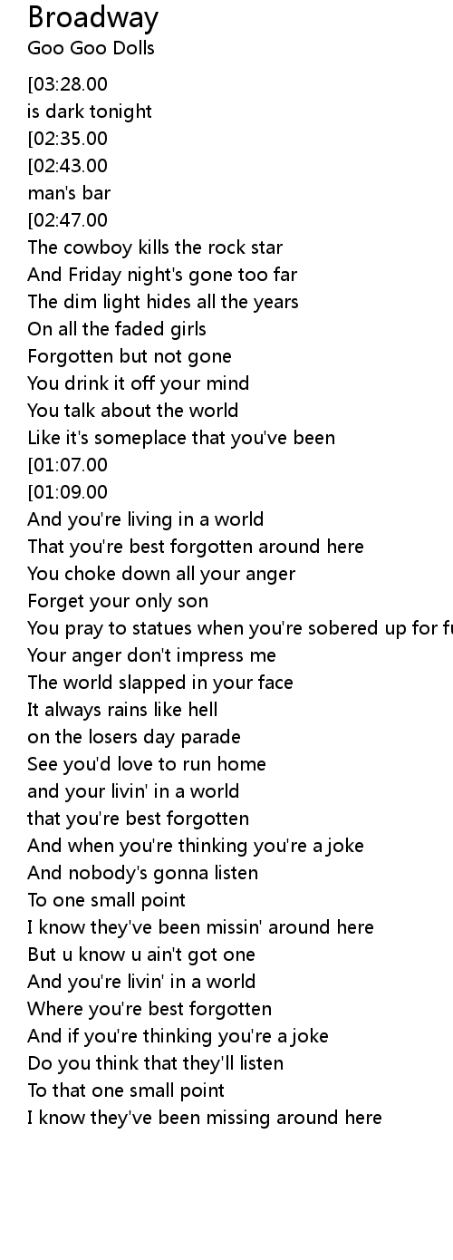 [03:35.00][03:28.00][02:38.00][02:31.00][01:26.00][01:19.00][00:21.00][00:13.00] Broadway is dark tonight