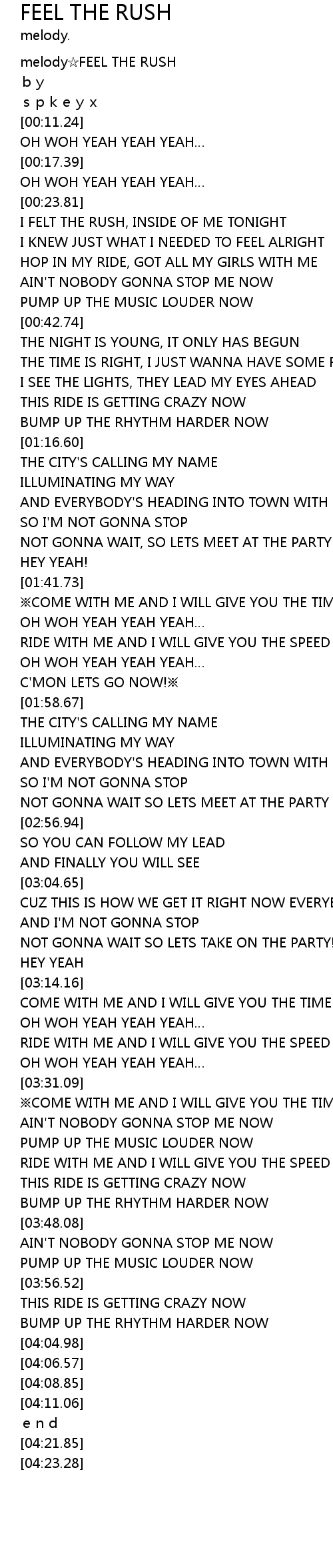 | [00:00.08] | melody FEEL THE RUSH |