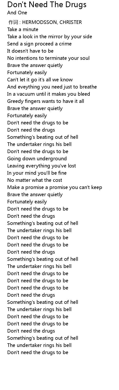 | [02:11.020] | Don' t need the drugs |
