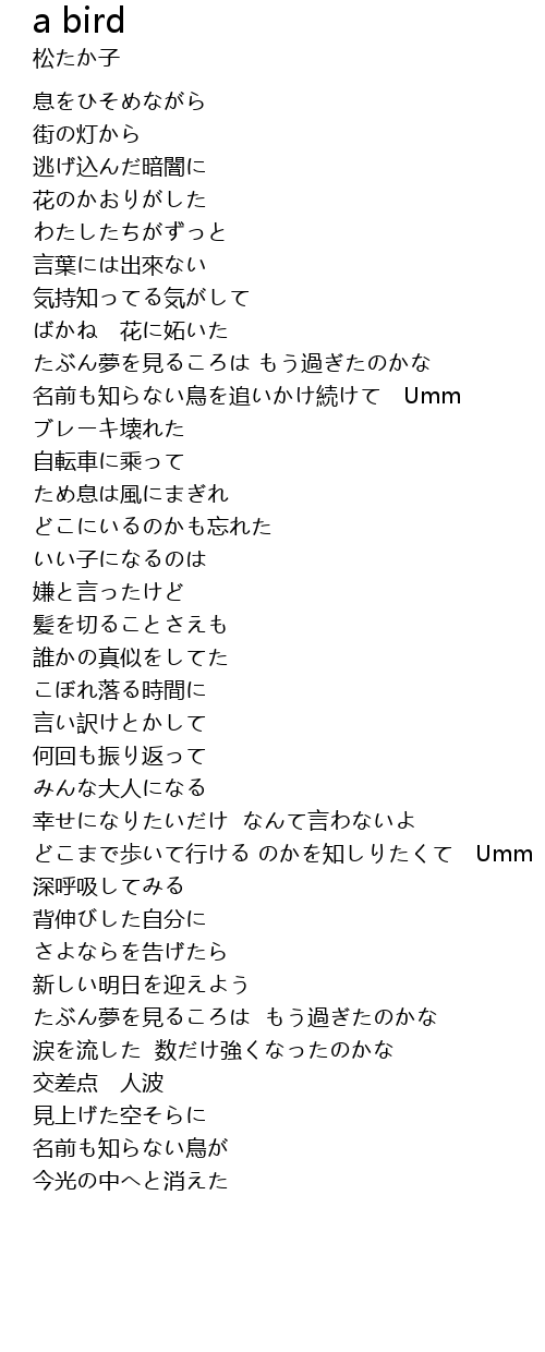 | [01:17.500] | 名前も知らない鳥を追いかけ続けて Umm |