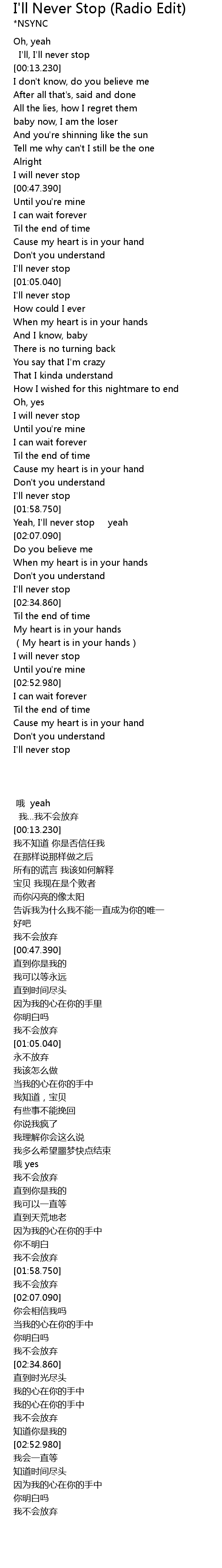| [02:00.930] | Yeah, I' ll never stop yeah |