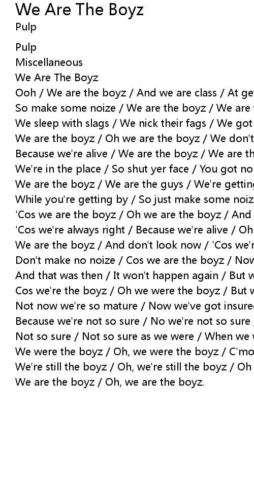 We are the boyz / And don't look now / 'Cos we're coming down |