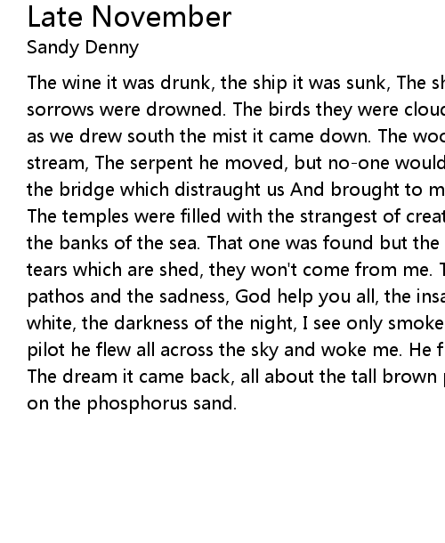 The wine it was drunk, the ship it was sunk, The shot it was dead, all the sorrows were drowned. The birds they were clouds, the brides and the shrouds And as we drew south the mist it came down. The wooded ravine to the wandering stream, The serpent he moved, but no-one would say. The depths of the waters, the bridge which distraught us And brought to me thoughts of the ill-fated day. The temples were filled with the strangest of creatures One played it by ear on the banks of the sea. That one was found but the others they went under. Oh the tears which are shed, they won't come from me. The methods of madness, the pathos and the sadness, God help you all, the insane and wise. The black and the white, the darkness of the night, I see only smoke from the chimneys arise. The pilot he flew all across the sky and woke me. He flew solo on the mercury sea. The dream it came back, all about the tall brown people, The sacred young herd on the phosphorus sand. |