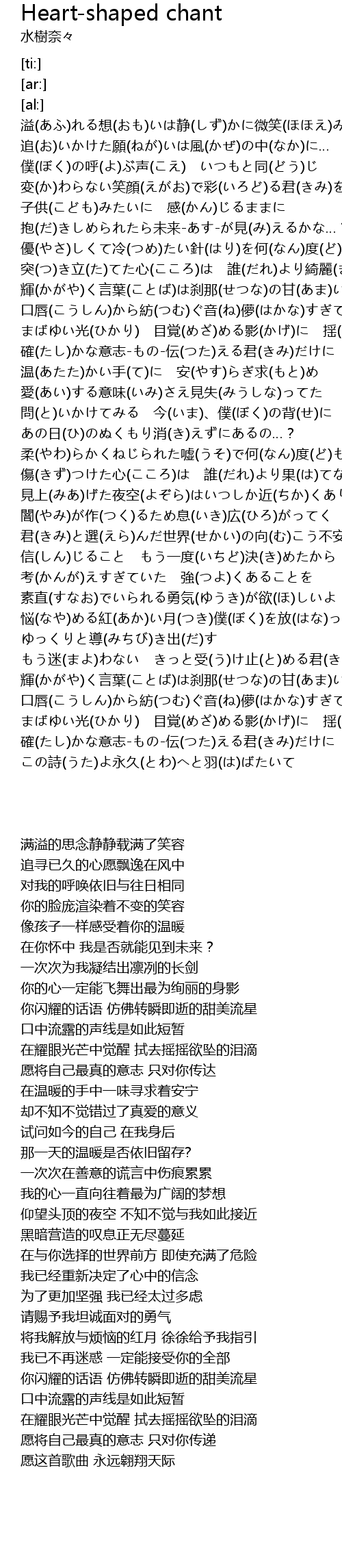 | [00:01.02] | 溢(あふ)れる想(おも)いは静(しず)かに微笑(ほほえ)みたたえる |