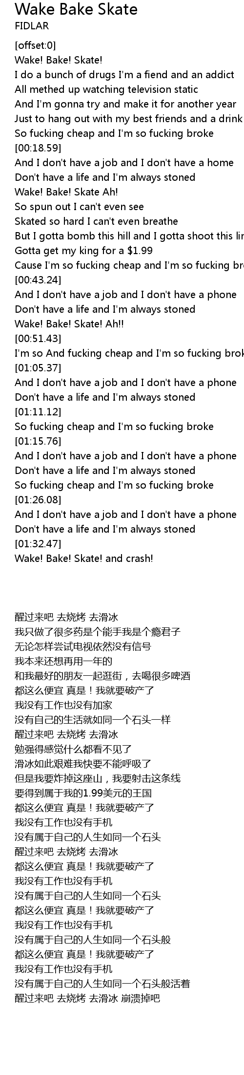 | [01:33.10] | Wake! Bake! Skate! and crash! |
