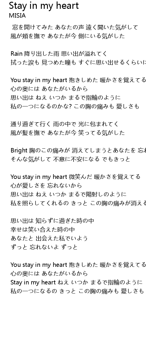 | You stay in my heart 微笑んだ 暖かさを覚えてる | |