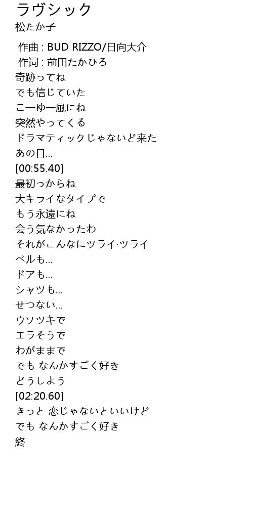 | [02:38.48] | きっと 恋じゃないといいけど |