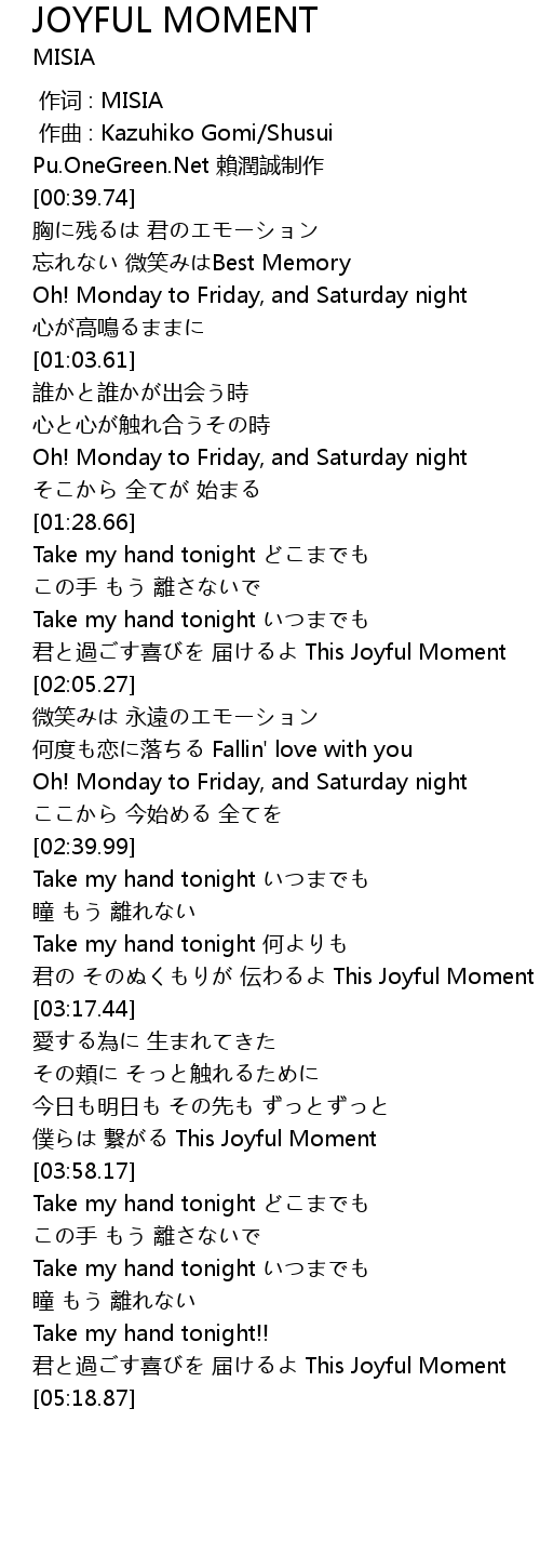 | [03:48.39] | 僕らは 繋がる This Joyful Moment |