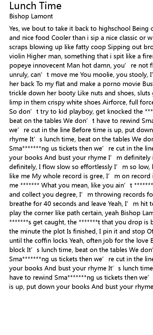 | Yes, we bout to take it back to highschool Being on the nice tabletops, bishop and nice food Cooler than i sip a nice classic or when I play pool Domino fat scraps blowing up like fatty coop Sipping out broken, ain' t no picture playing violin Higher man, something that i spit like a fireman I am what I am, like popeye innovecent Man hot damn, you' re not flier higher than Yours truly, unruly, can' t move me You moolie, you stooly, I' ll kidnap your cutie, take her back To my flat and make a porno movie Bust a nut on her back and let it trickle down her booty Like nuts and shoes, sluts gonna choose That pimp with a limp in them crispy white shoes Airforce, full force , that' s what I' m about So don' t try to kid playboy, get knocked the out It' s lunch time, beat on the tables We don' t have to rewind Sma ng us tickets then we' re cut in the line Before time is up, put down your books And bust your rhyme It' s lunch time, beat on the tables We don' t have to rewind Sma ng us tickets then we' re cut in the line Before time is up, put down your books And bust your rhyme I' m definitely in the house, you know? Most definitely, I flow slow so effortlessly I' m so low, but who know go second like me My whole record is gree, I' m on record indeed The whole west is with me What you mean, like you ain' t with o consecutive street Go and collect you degree, I' m throwing records for G' s A hundred G' s I breathe for 40 seconds and leave Yeah, I' m hit to backburn game That' s why I play the corner like path certain, yeah Bishop Lamont in war in G, war with me s get caught, the t that you drop is boring me I figured you flop, the minute the plot Is finished, I pin it and stop Off the rocks, unorthodox, until the coffin locks Yeah, often job for the love Because I ain' t off the block It' s lunch time, beat on the tables We don' t have to rewind Sma ng us tickets then we' re cut in the line Before time is up, put down your books And bust your rhyme It' s lunch time, beat on the tables We don' t have to rewind Sma ng us tickets then we' re cut in the line Before time is up, put down your books And bust your rhyme |