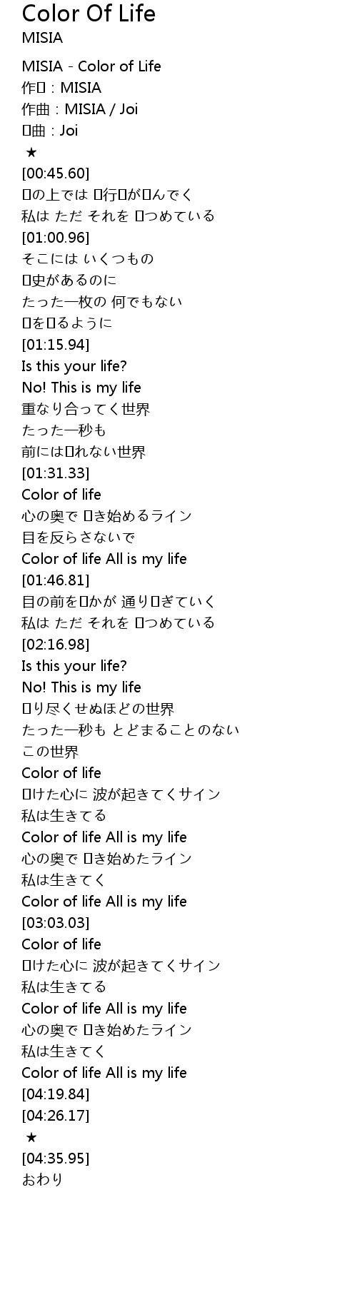 | [00:00.00] | MISIA Color of Life |