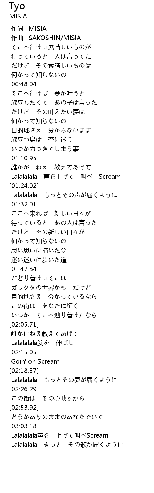 | [00:01.000] | zuo qu : SAKOSHIN MISIA |