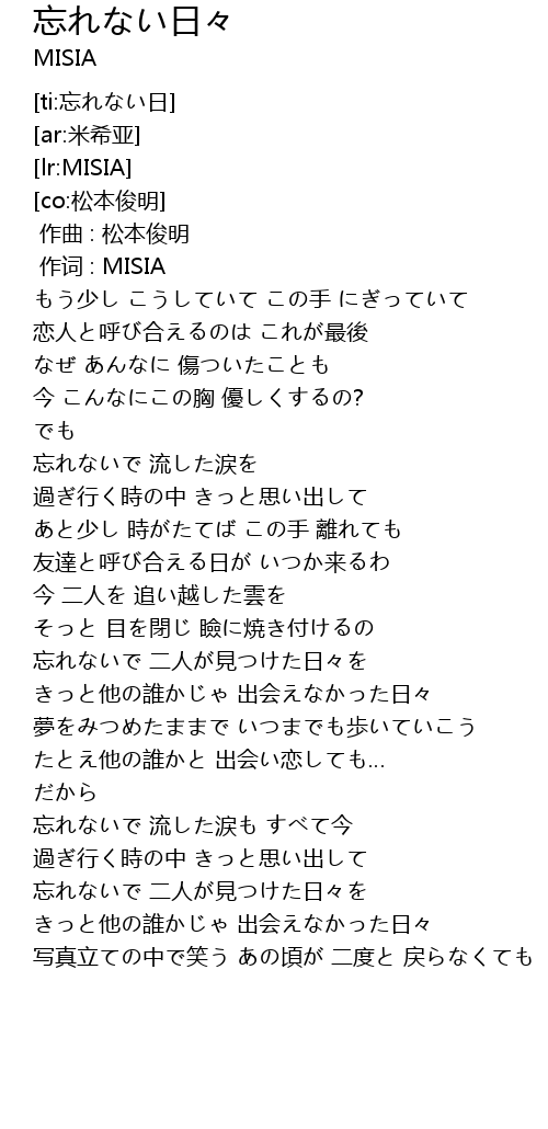 | [02:42.293] | 忘れないで 二人が見つけた日々を |