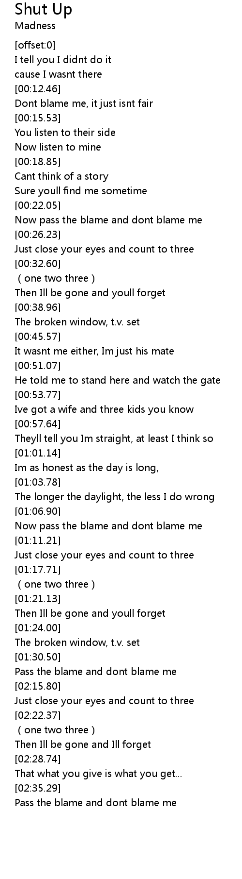 | [00:49.13] | It wasnt me either, Im just his mate |