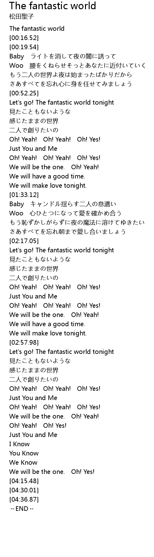 | [00:39.11] | もう二人の世界よ夜は始まったばかりだから |