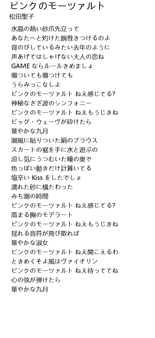| [03:10.141] | ピンクのモーツァルト ねえ聞こえるわ |