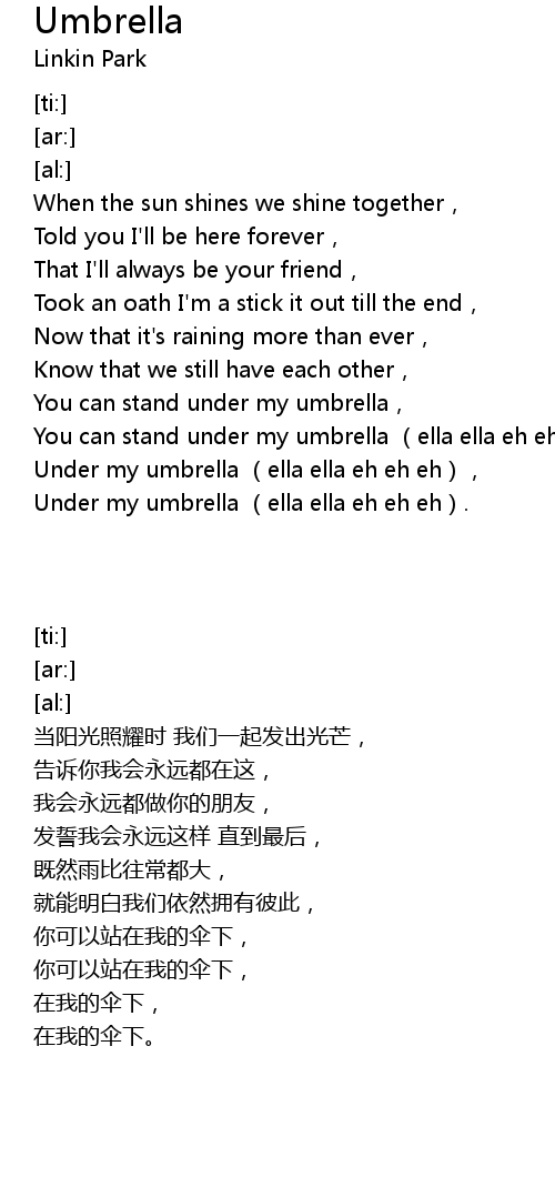 | [01:22.48] | Under my umbrella (ella ella eh eh eh). |