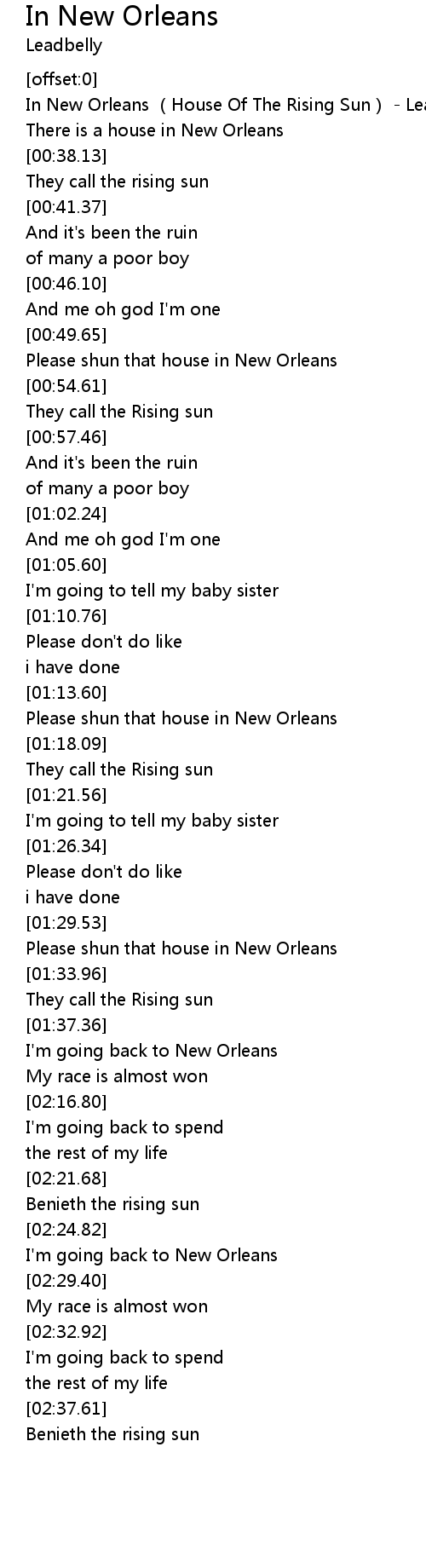 | [00:01.30] | In New Orleans (House Of The Rising Sun) - Lead Belly |