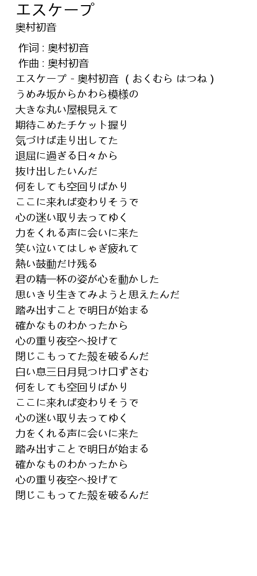 | [00:01.300] | エスケープ - 奥村初音 (おくむら はつね) |