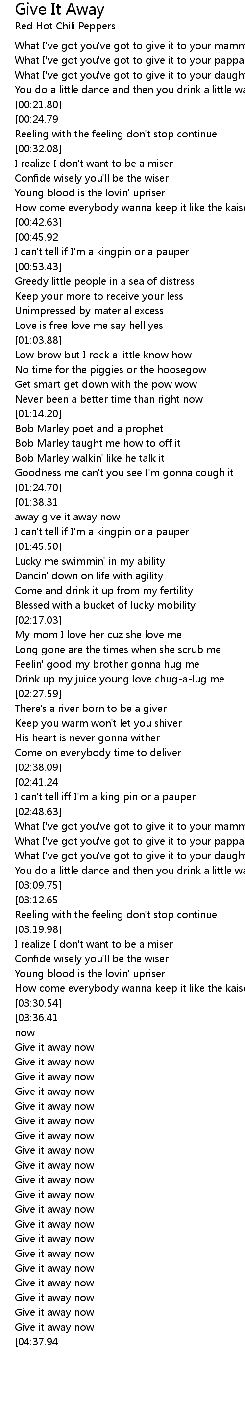 [01:40.86][01:38.31][01:35.30][01:30.29][01:27.82][01:25.00] Give it away give it away give it away now