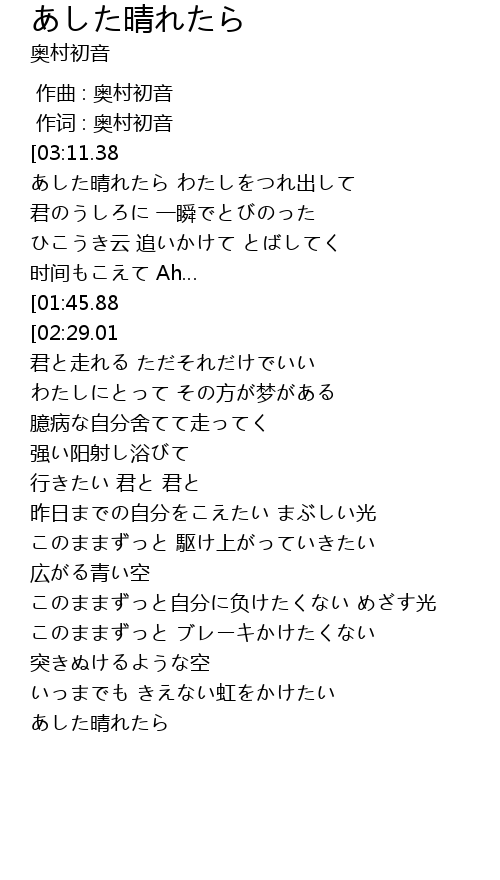 | [00:36.01] | あした晴れたら わたしをつれ出して |