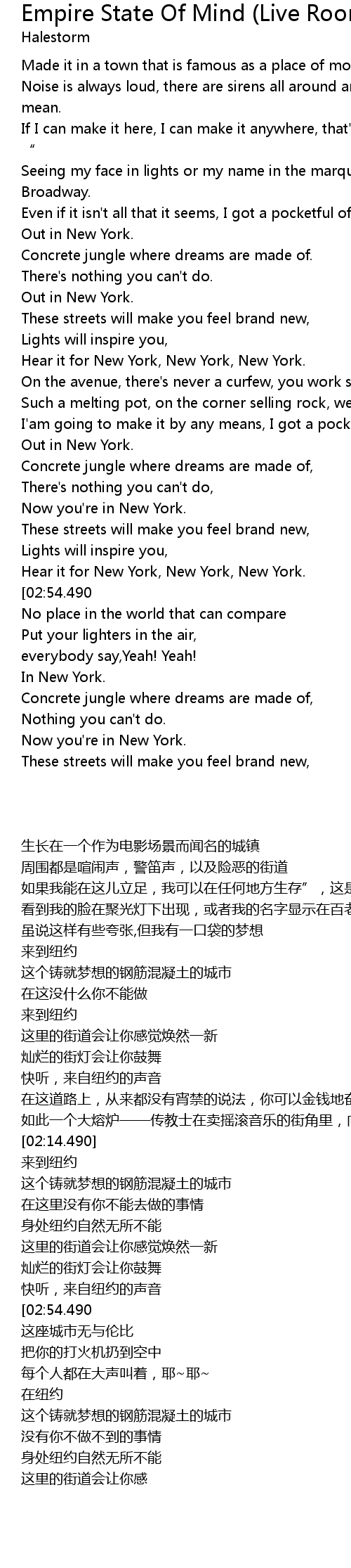 | [01:13.490] | Concrete jungle where dreams are made of. |