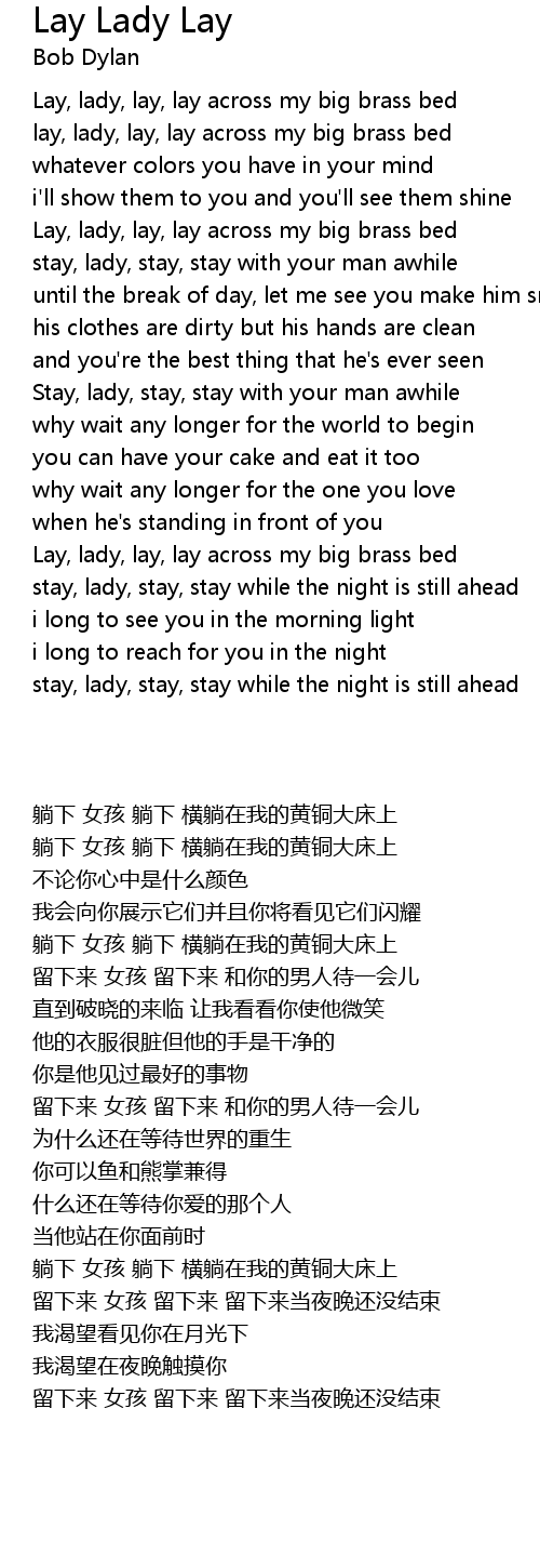 [00:13.48] Lay, lady, lay, lay across my big brass bed