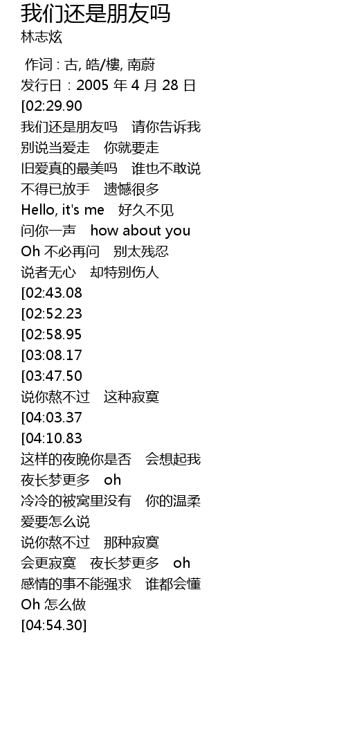 | [00:20.42] | 我们还是朋友吗 请你告诉我 |