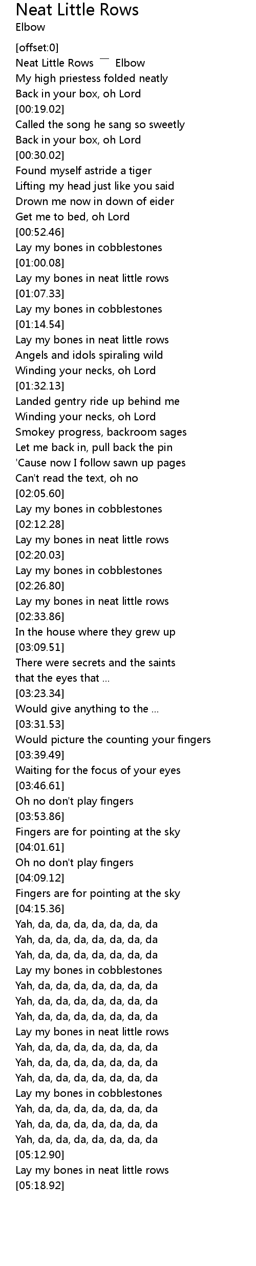 | [00:02.49] | Neat Little Rows ―― Elbow |