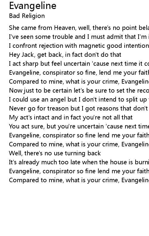 Evangeline, conspirator so fine lend me your faith 'cause mine is broken |