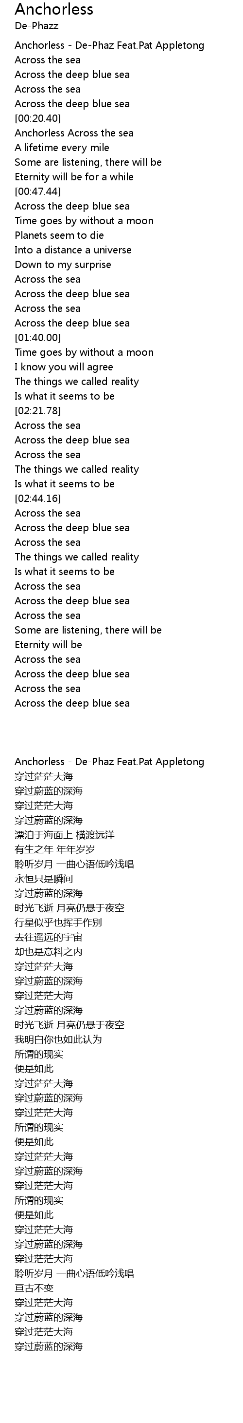 | [00:00.00] | Anchorless - De-Phaz Feat.Pat Appletong |