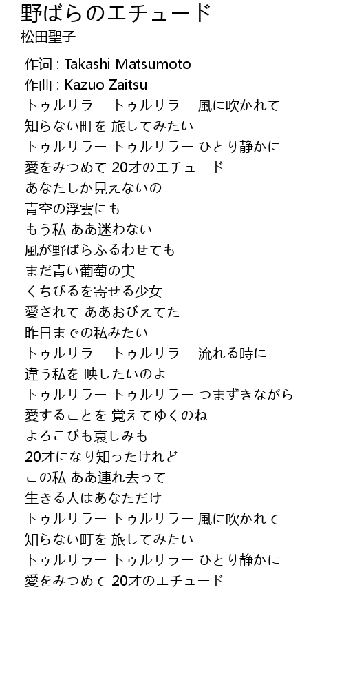 | [00:21.577] | トゥルリラー トゥルリラー 風に吹かれて |