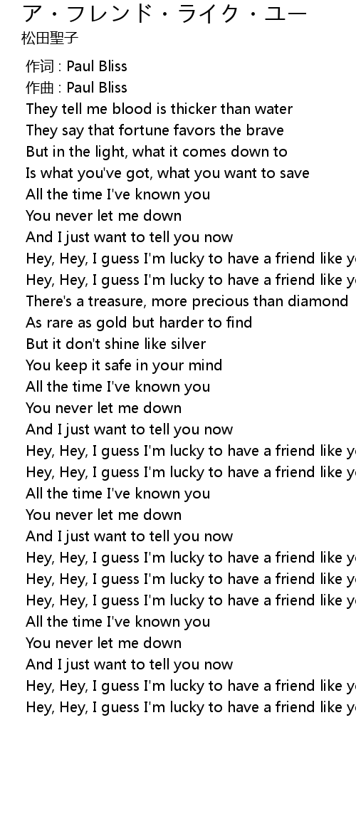 | [01:38.291] | Hey, Hey, I guess I' m lucky to have a friend like you |